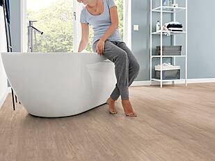 WATERCORK PLUS is a waterproof design flooring for floating glueless installation. Due to the newly developed lock system "PressFit", WATERCORK PLUS can be installed quickly and easily in all rooms, even in wet areas such as bathrooms and kitchens. With a height of only 6 mm, WATERCORK PLUS can also be installed on existing hard flooring. The innovative development of the waterproof cork middle layer made of a cork granulate mixture is extraordinarly strong and provides all the advantages of a cork flooring. At the same time, the recovery properties of the cork are not affected and due to the comfort of cork it is a unique design flooring with excellent features.